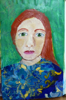 Here is today's portrait, I must have painted her dress three or four times and it kept getting worse. I get impatient with acrylic paints sometimes and try to paint on top of colors that really need to dry first. At these times I just give up and add paper.